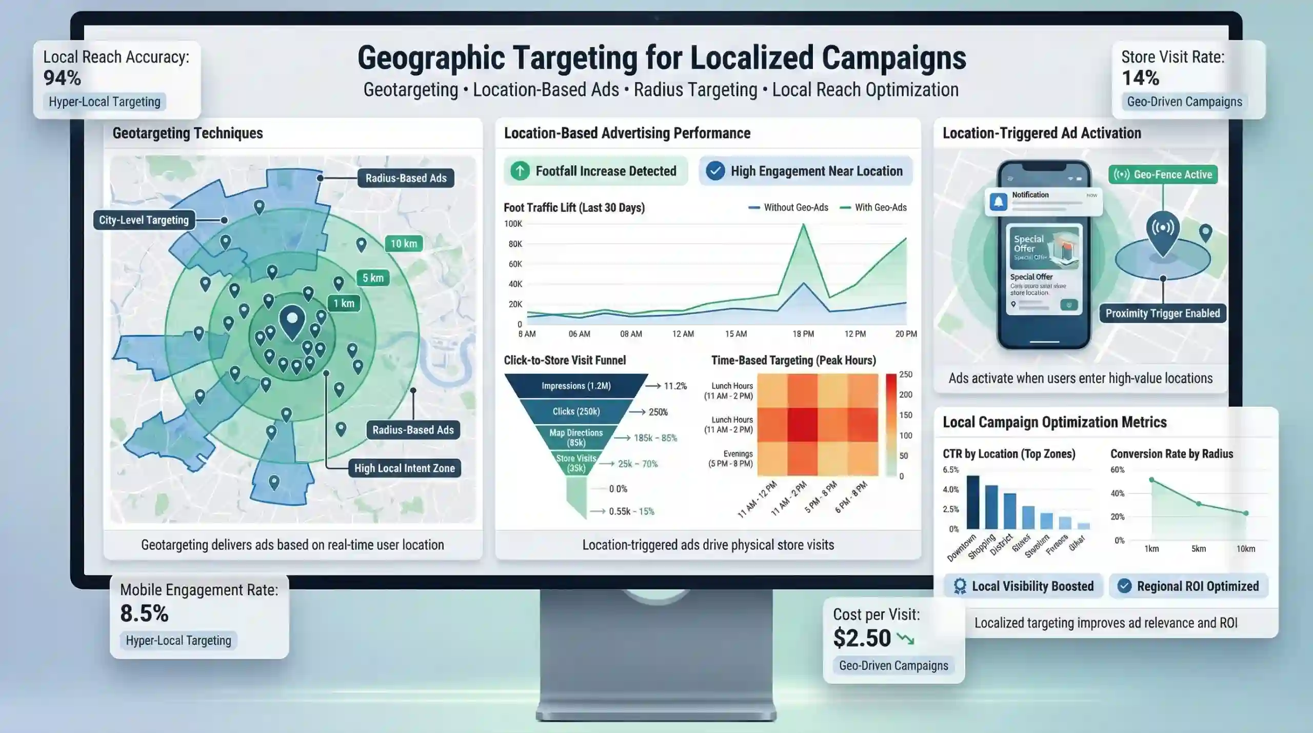 Geotargeting involves using users’ physical location data to deliver geographically relevant ads. Techniques include city-level, regional, or radius-based targeting. For instance, a local restaurant can target users within a 5 km radius during lunch hours to increase foot traffic.