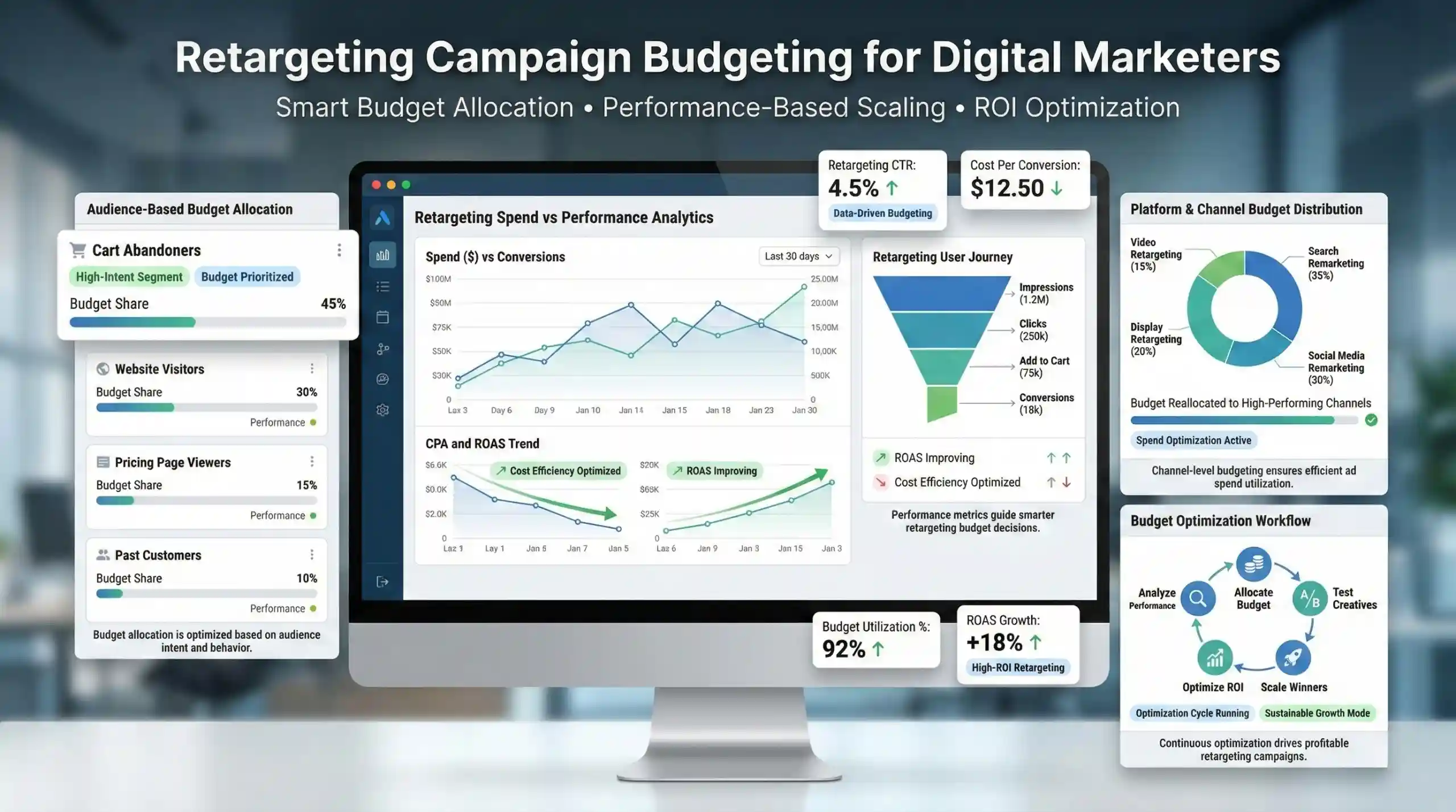 Metrics such as CTR, conversion rate, and CPA are crucial indicators for allocating the retargeting budget dynamically. This iterative process enhances ROAS and overall campaign efficiency.