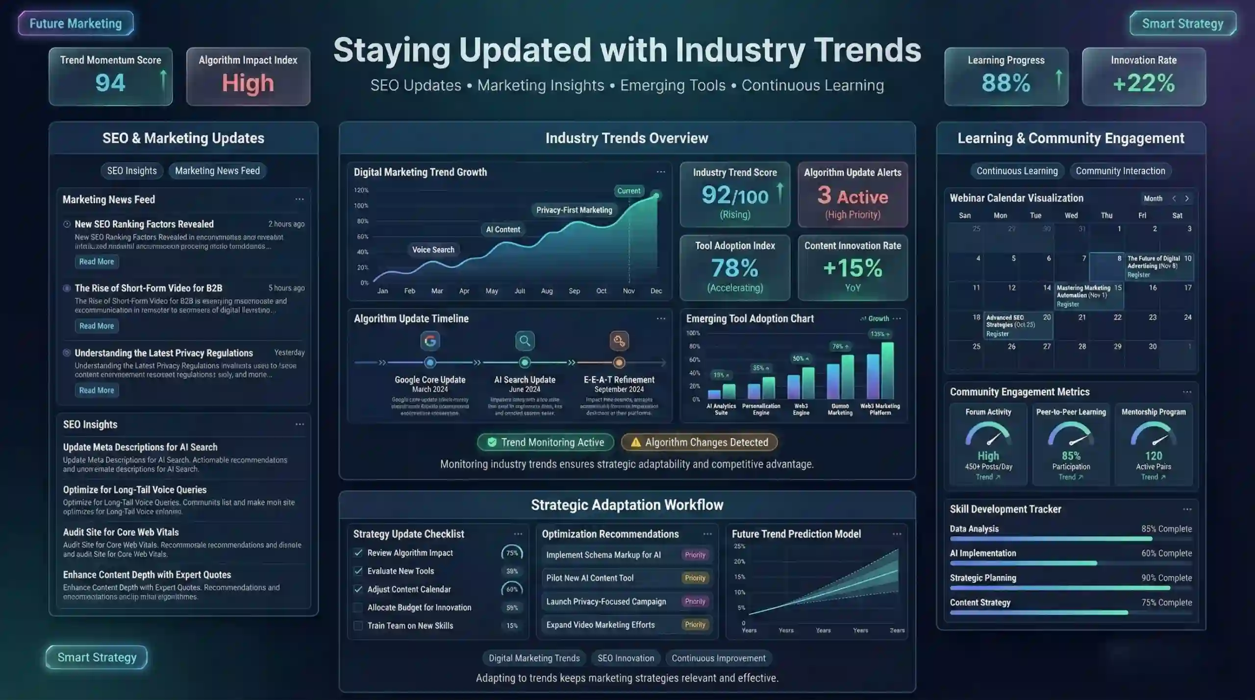 Continuous learning involves following respected blogs (e.g., Moz, Neil Patel, HubSpot), attending webinars, and engaging in digital marketing communities. Staying informed about search engine algorithm updates and new tools guarantees your approach remains current and effective.