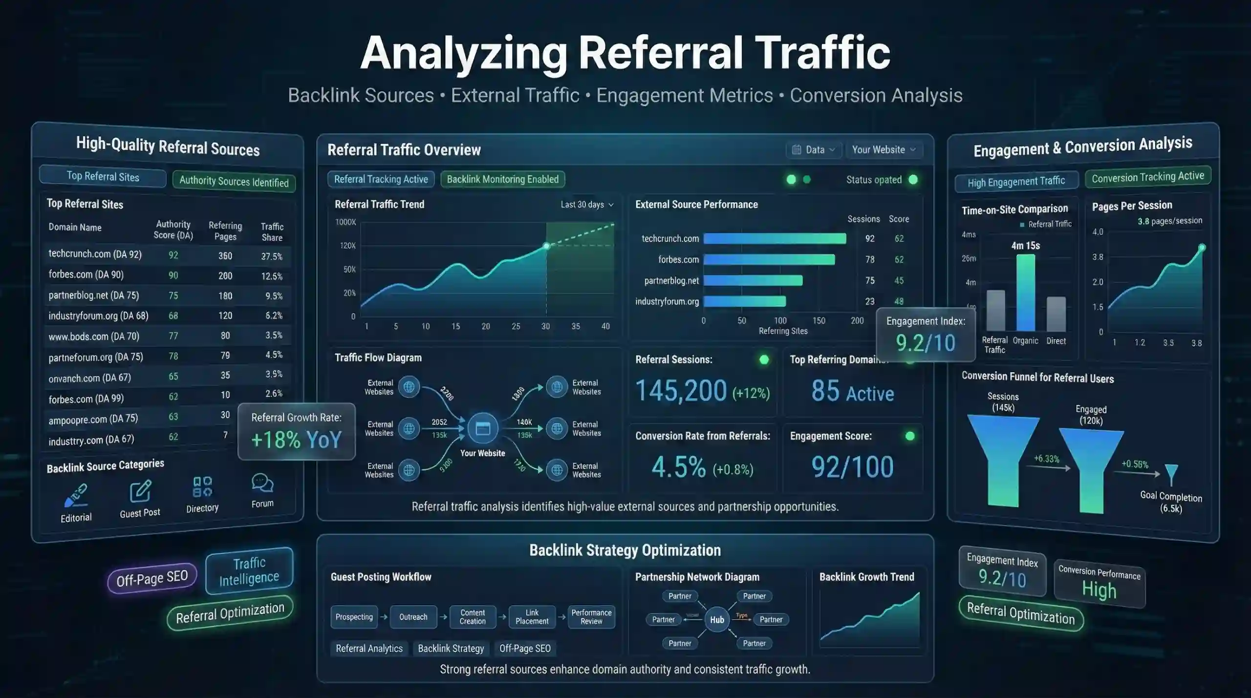 - Referral Traffic: Visitors arriving via backlinks or partnerships, signifying the influence of backlink building and external content promotions.