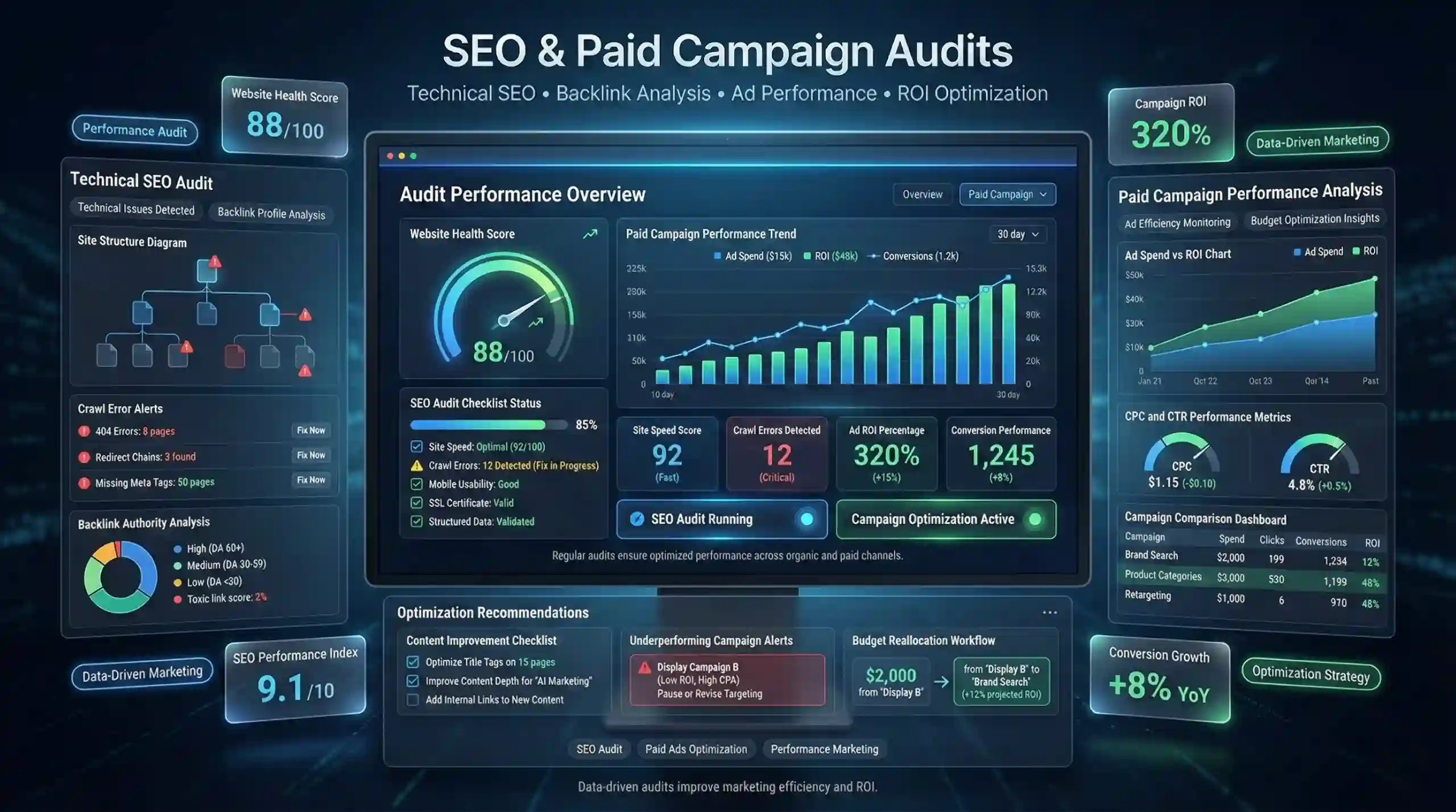 Analyze ad spend efficiency, performance metrics, and creative relevance. Pause or optimize underperforming campaigns based on data insights and reallocate funds to high ROI channels.