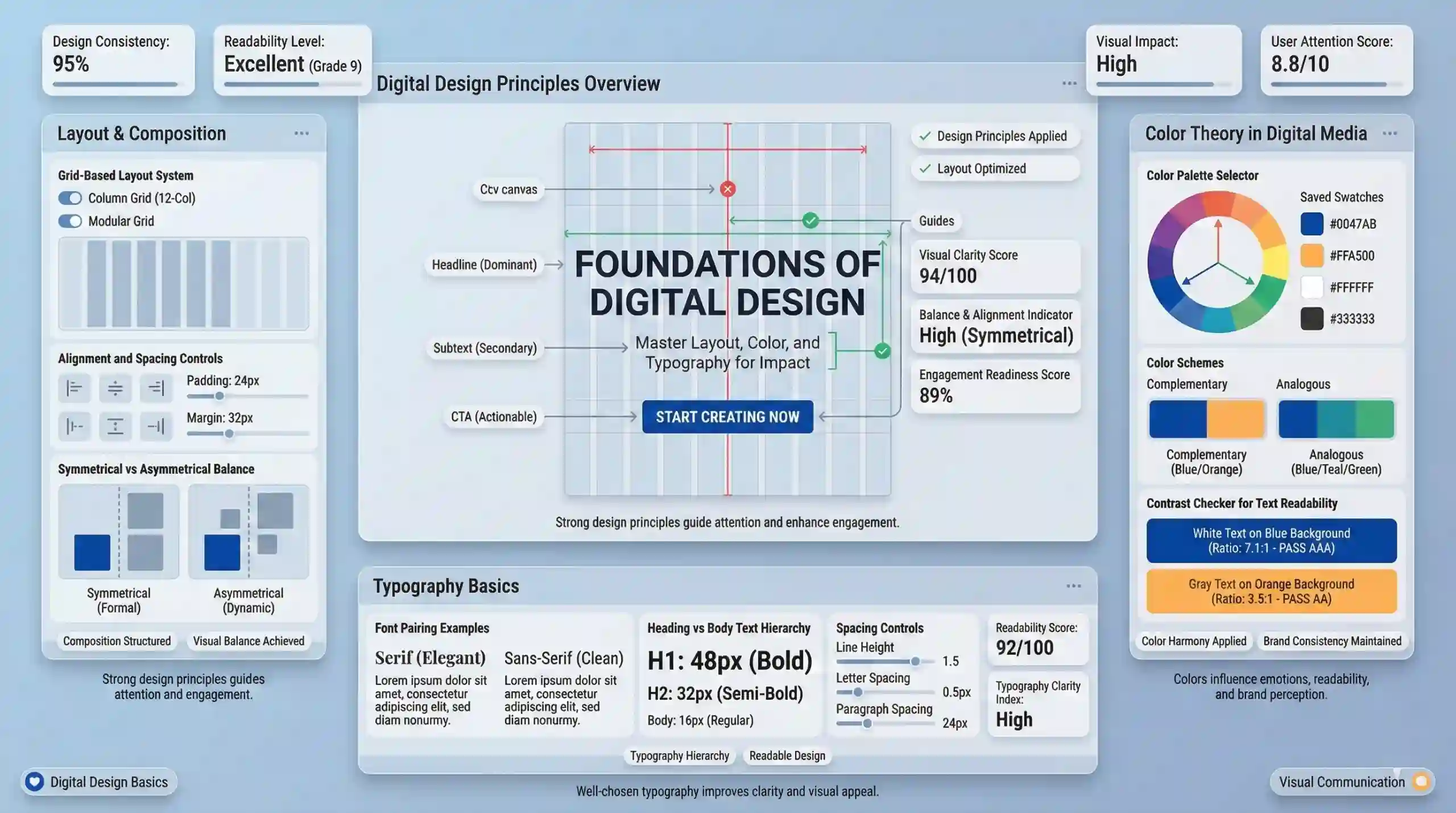 Color psychology explores how colors evoke emotions and influence perceptions. Digital design benefits from understanding color harmony—combinations that are aesthetically pleasing—such as complementary or analogous palettes. Color palettes optimized for digital screens consider readability and brand consistency. For example, blues project trust, while reds evoke excitement, making them suitable for call-to-action buttons.