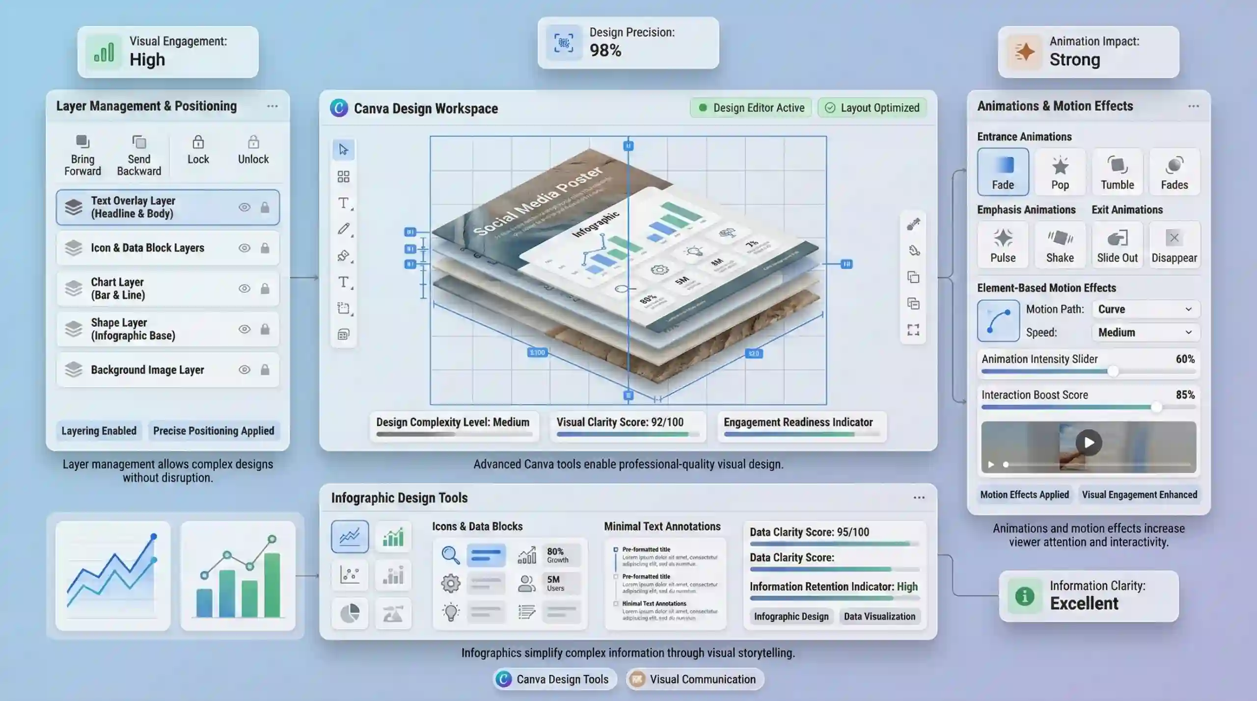 Infographics succinctly visualize data, making complex information accessible. Canva provides customizable templates, charts, and icons that support the creation of data-driven visuals. Proper data visualization emphasizes clarity and simplicity to improve retention and comprehension.