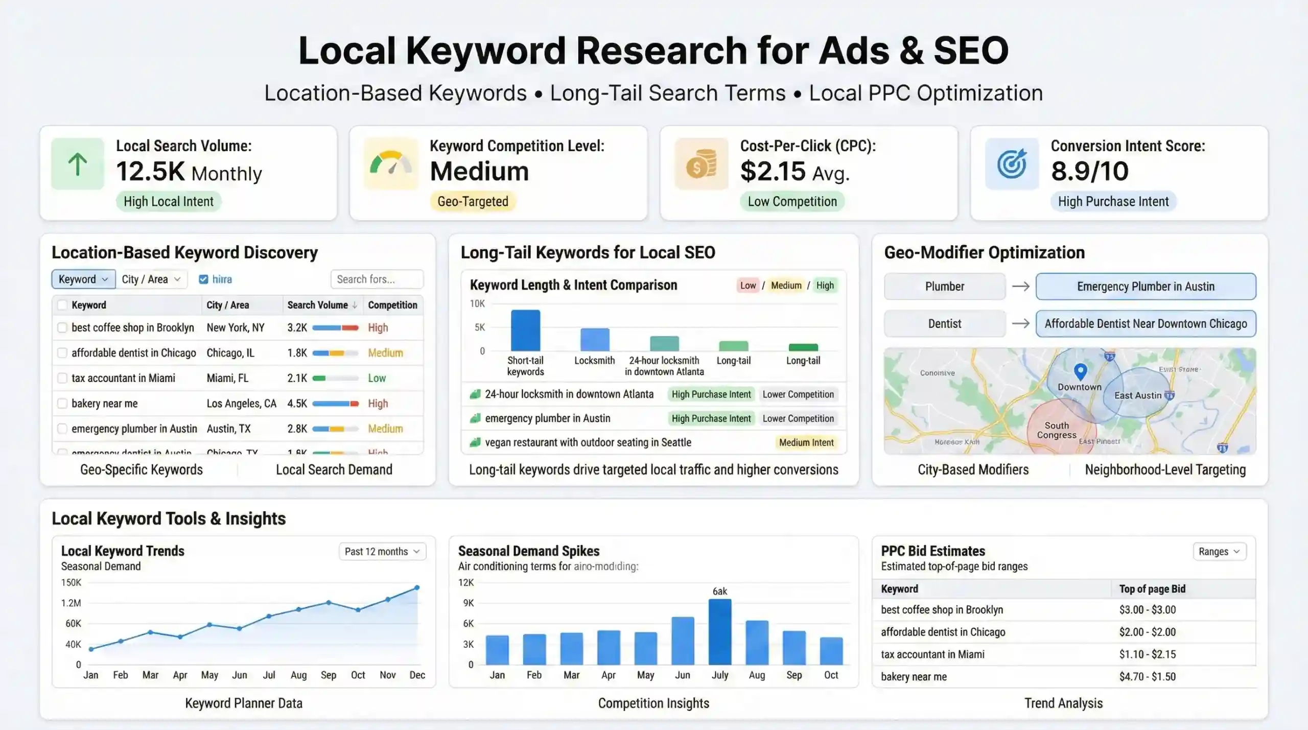 Long-tail keywords contain specific location details and indicate high user intent. They attract highly targeted traffic and have lower competition. Example: “24-hour locksmith in downtown Atlanta” rather than simply “locksmith.” Such keywords improve local PPC targeting accuracy and conversion potential.