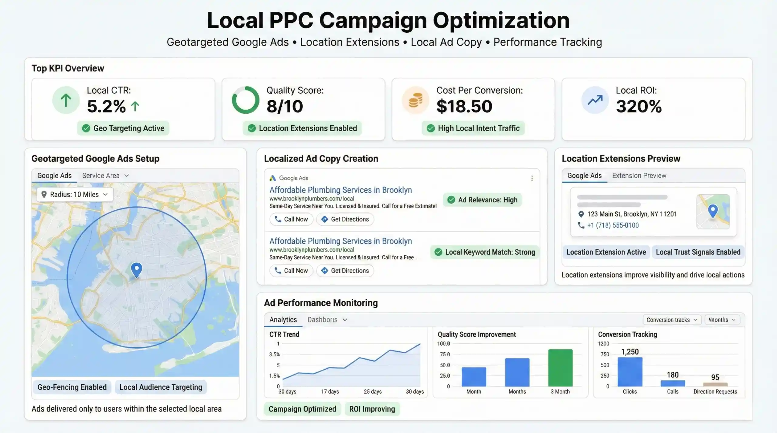 Tracking metrics such as CTR, Quality Score, and conversions enables continual campaign optimization, improving ROI of local advertising spends.